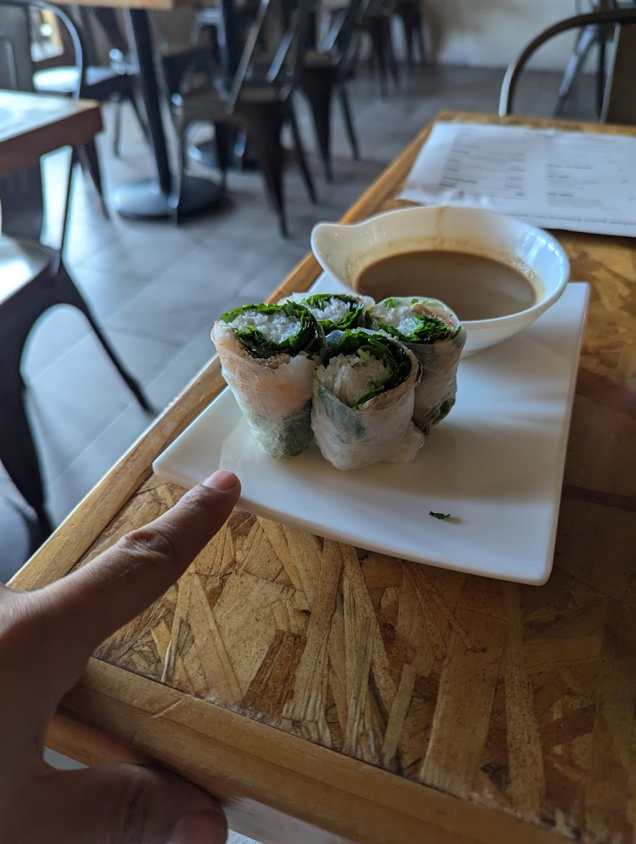 I was on a bachelorette trip in Palm Springs, a total of 6 of us. Our plan after we flew in on Friday was to get take out from here but unfortunately, they don’t do take out. However, I’m glad we didn’t! We would’ve missed the whole experience of this restaurant. I think we got there around 6 pm on Friday and it was packed, we had a 15 minute wait. Completely worth the wait, the food was delicious. Our group did a couple of appetizers and then chose our own main entree. The drinks were delicious and before you get any of your ordered food items, they bring out a little rice porridge, on the house - it was very good! We were pretty hungry so I didn’t take pics of all the food. I highly recommend the fresh rolls!! We tried: Shrimp & Mango, Fennel, and Lemongrass Pork & Date. All 3 were so so good. Favorite out of the 3 would probably be shrimp & mango. For my main, I had the lemongrass pork noodle bowl which is essentially a cold noodle dish. The pork was cooked to perfection and the veggies were all fresh. If you get the chance to try this place out, do it!